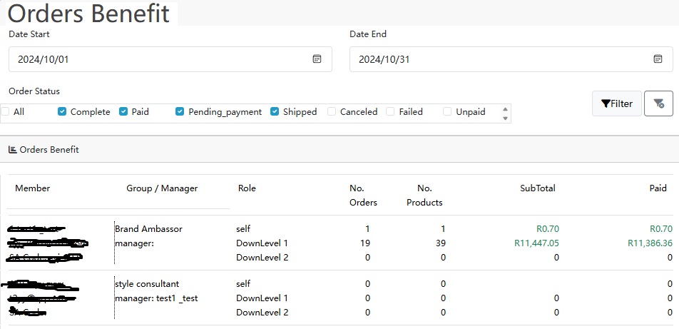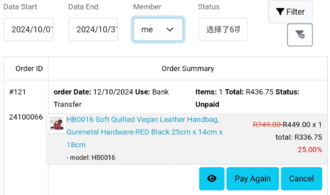 - default only show your orders. but if you want to see your member's order, please select from "Member" dropdown-list, then click "Filter" button to see the result