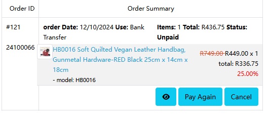 if the order status is "Pending payment" or "Unpaid", and not in 24 hours after confirm order, you can "Pay again".